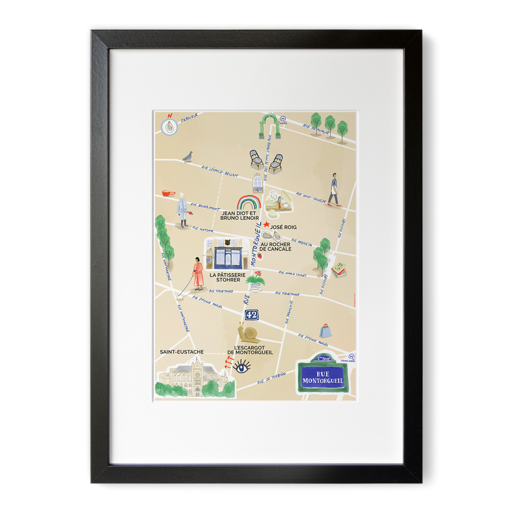 This illustrated map of Rue Montorgueil, Paris captures the spirit of the street through a hand-drawn perspective, highlighting its most emblematic spots and atmosphere. Designed as a visual walk, it invites you to wander the street again - whether you know it by heart or are discovering it for the first time.